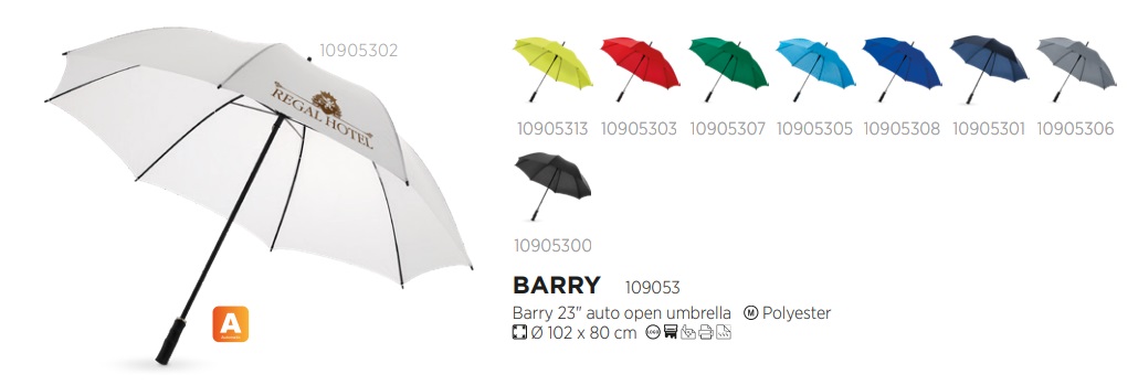 De Barry paraplu is niet voor niets een bestseller. De 23" paraplu schuift automatisch open in slechts één klik. Hij is gemaakt van polyester, een duurzaam materiaal waarmee men door de regen kan lopen zonder nat te worden. Verder heeft de paraplu een metalen schacht, metalen baleinen en een kunststof handvat. De Barry paraplu biedt meerdere mogelijkheden voor het plaatsen van een logo of teksten en is verkrijgbaar in diverse kleuren. 190T van Polyester. Prijs grotere aantallen en voor bedrukking zijn op aanvraag. Bij bestelling of prijsaanvraag gewenste kleur of kleuren vermelden.