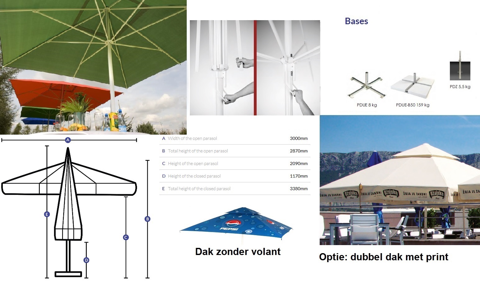 Hoogwaardige professionele parasol zonder volants (volants of wel hangende strook tegen bescheiden meerprijs verkrijgbaar) met digitaal full colour print met een hoge UV resistentie voor een langdurig behoud van kleuren. Bedrukking van de dakvlakken en/of de volants moeten gelijk zijn. Door de hoek van de dakvlakken zijn de full colour bedrukking zelfs op korte afstanden nog goed waar te nemen. Doek is van 210 grams gecoat parasoldoek (100% polyester, waterproof) en rondom afgewerkt. Door de coating wordt zowel water alsook het vuil door het doek afgestoten. Afmetingen zie afbeelding. Uitgevoerd in wit (RAL 9016) met een centrale staander met een diameter van 60 mm en een wanddikte van 1,5 mm. Frame heeft 8 armen van 30x17,6 mm die enkelvoudig ondersteund worden. Telescopische robuust hijssysteem waardoor u in de regel de tafels en stoelen niet hoeft te verwijderen voordat u parasol opent of sluit (zie afbeelding). Exclusief parasolvoet; aanbevolen voor deze uitvoering PDUE+TEGELS en de bodemhuls PDZ. Zie voor keuze parasolvoet bijlage en voor prijs hiervan zie bij parasolvoet. Optie tegen bescheiden meerprijs: dubbel dak (zie afbeelding) met of zonder full colour print, regengoot voor koppelen van parasols en brandvertragende behandeling. Bij grotere aantallen prijs op aanvraag. drukklaar bestand aanleveren. Tegen meerprijs kunnen wij deze ook voor u opmaken.