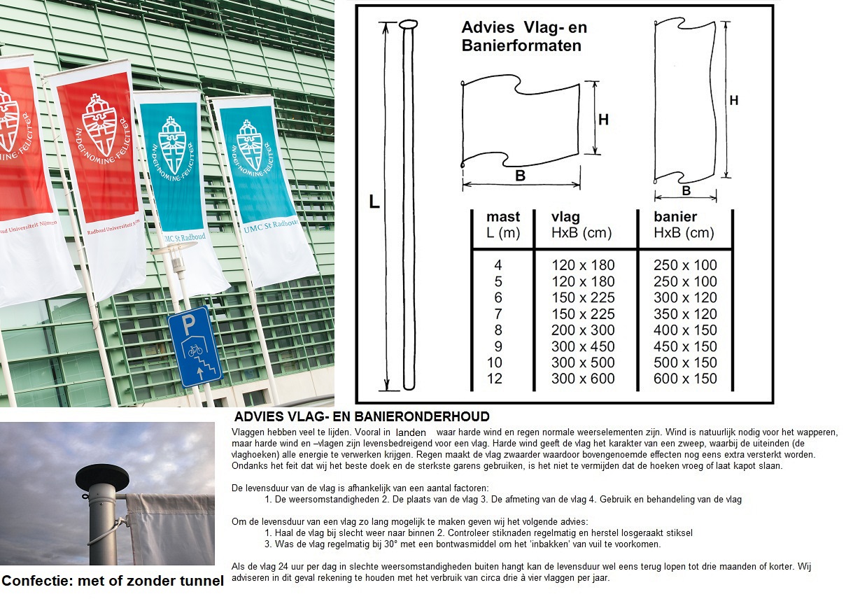 Scheeps- c.q. stormbanieren zijn geproduceerd van spunpolyester 160 grams en zijn bijna 50% zwaarder dan de standaard glans polyester vlaggen. Deze dikkere vlaggen zijn extra bestand tegen de vaak hoge windsnelheden die nu eenmaal op het water vaker voorkomen vandaar dat ze vaak ook scheepsvlaggen genoemd worden. Ze worden ook op land toegepast daar waar ook erg hoge windsnelheden van toepassing zijn, zoals bijvoorbeeld in het kustgebied. De duurzaamheid is absoluut groter dan bij standaard vlaggendoek. Deze spunpolyester vlaggen worden digitaal bedrukt via dubbelzijdige spray, UV bestendig met 100% doordruk. Met de techniek van dubbelzijdige spray benaderen we de techniek van zeefdruk met het voordeel dat het milieutechnisch gunstiger is. Met digitale spray aan een kant en spiegelbeeld spray aan de andere kant realiseren we aan beide kanten van de vlag een even krachtige kleur. Bij deze techniek vragen wij indien bekend ook de PMS kleuren van het drukbestand op zodat wij die kleuren digitaal zo goed mogelijk kunnen benaderen. De vlag wordt verder volledig geconfectioneerd, rondom gezoomd en indien gewenst aan de bovenzijde voorzien van een open zoom t.b.v. uithouder/galg en aan de mastzijde voorzien van kopband en clips.De vlag wordt verder volledig geconfectioneerd, rondom gezoomd en indien gewenst aan de bovenzijde voorzien van een open zoom t.b.v. uithouder/galg en aan de mastzijde voorzien van kopband en clips. Printklaar PDF-bestand aanleveren op basis van de afmeting van de banier. Tegen meerprijs kunnen wij die ook voor u opmaken.