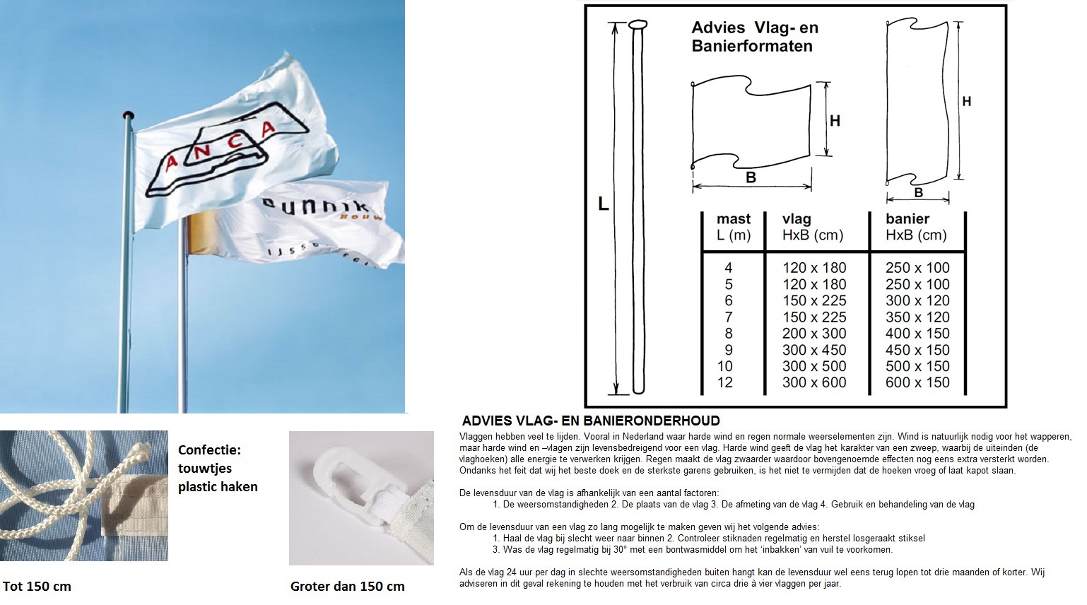 Scheeps- c.q. stormvlaggen zijn geproduceerd van spunpolyester 160 grams en zijn bijna 50% zwaarder dan de standaard glans polyester vlaggen. Deze dikkere vlaggen zijn extra bestand tegen de vaak hoge windsnelheden die nu eenmaal op het water vaker voorkomen vandaar dat ze vaak ook scheepsvlaggen genoemd worden. Ze worden ook op land toegepast daar waar ook erg hoge windsnelheden van toepassing zijn, zoals bijvoorbeeld in het kustgebied. De duurzaamheid is absoluut groter dan bij standaard vlaggendoek. Deze spunpolyester vlaggen worden digitaal bedrukt via dubbelzijdige spray, UV bestendig met 100% doordruk. Met de techniek van dubbelzijdige spray benaderen we de techniek van zeefdruk met het voordeel dat het milieutechnisch gunstiger is. Met digitale spray aan een kant en spiegelbeeld spray aan de andere kant realiseren we aan beide kanten van de vlag een even krachtige kleur. Bij deze techniek vragen wij indien bekend ook de PMS kleuren van het drukbestand op zodat wij die kleuren digitaal zo goed mogelijk kunnen benaderen. De vlag wordt verder volledig geconfectioneerd, rondom gezoomd en aan de mastkant voorzien van kopband en clips. Printklaar PDF-bestand aanleveren op basis van de afmeting van de vlag. Tegen meerprijs kunnen wij die ook voor u opmaken.
