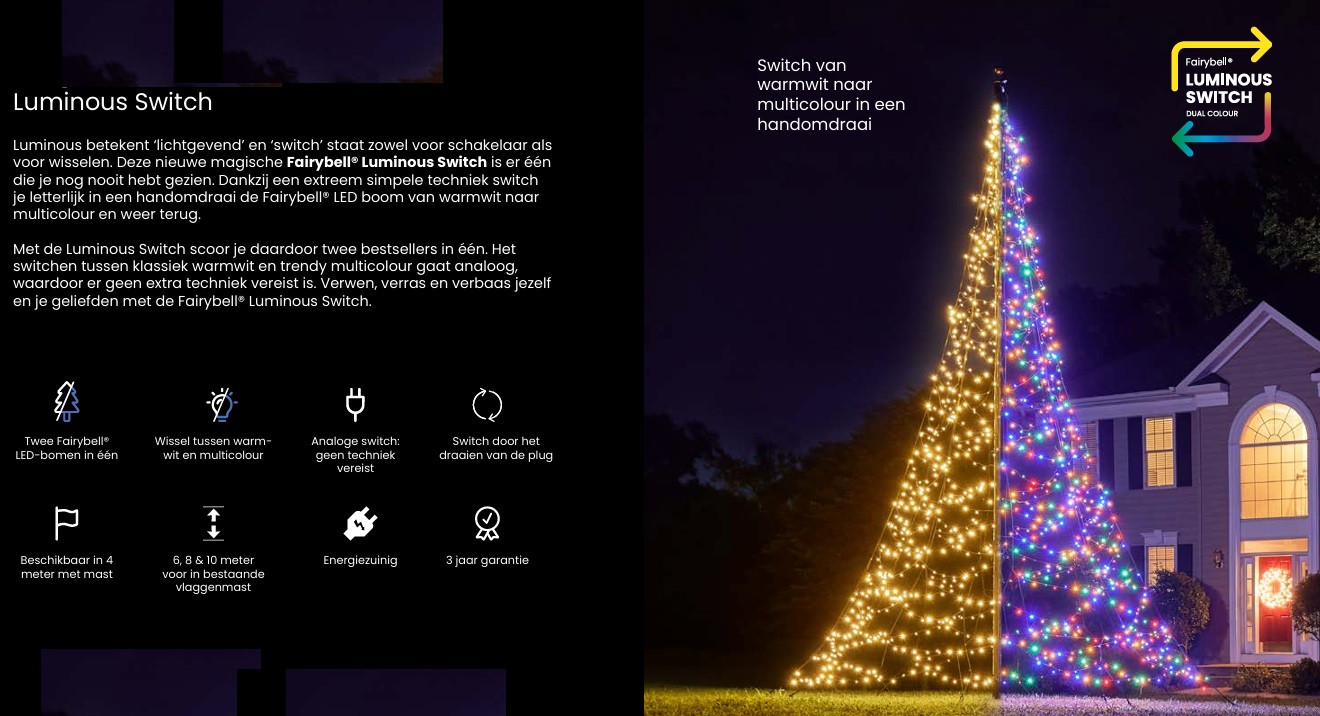 Deze luxe kerstboomverlichting met meerdere warm-witte en gekleurde LED lampjes voor in uw vlaggenmast is een echte eyecatcher in de winter. Deze nieuwe magische Fairybell® Luminous Switch is er één die je nog nooit hebt gezien. Dankzij een extreem simpele techniek switch je letterlijk in een handomdraai de Fairybell LED boom van warmwit naar multicolour en weer terug. Met de Luminous Switch scoor je daardoor twee bestsellers in één. Het switchen tussen klassiek warmwit en trendy multicolour gaat analoog, waardoor er geen extra techniek vereist is.Gelukkig is deze vlaggenmastverlichting binnen 30 tot 45 minuten op te zetten en heb je er daarna geen omkijken meer naar. U monteert de kerstverlichting aan de vlaggenlijn en die trekt u omhoog en de onderste 50 cm boven het maaiveld blijft dan vrij. De verlichting is bestand tegen alle weersinvloeden en hoeft alleen bij extreem harde wind even neergelaten te worden. De diameter bij dit systeem aan de onderkant is 3 m. De garantie op dit systeem is 3 jaar wat uniek is in de wereld van de kerstverlichting.
