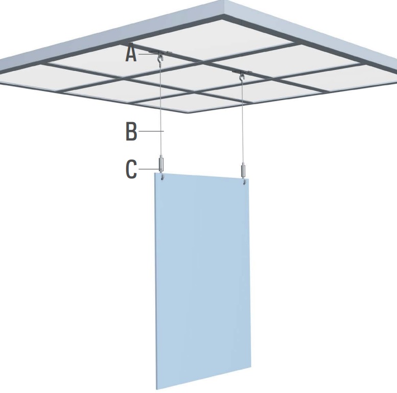 De set bestaat uit staalkabeltjes met haak en met lengte van 200 cm, 2x plafondbevestiging voor een systeemplafond en haken voor de platen die voorzien zijn van een ingenieus druksysteem waarmee u eenvoudig de kabel vastzet en op hoogte kunt instellen.